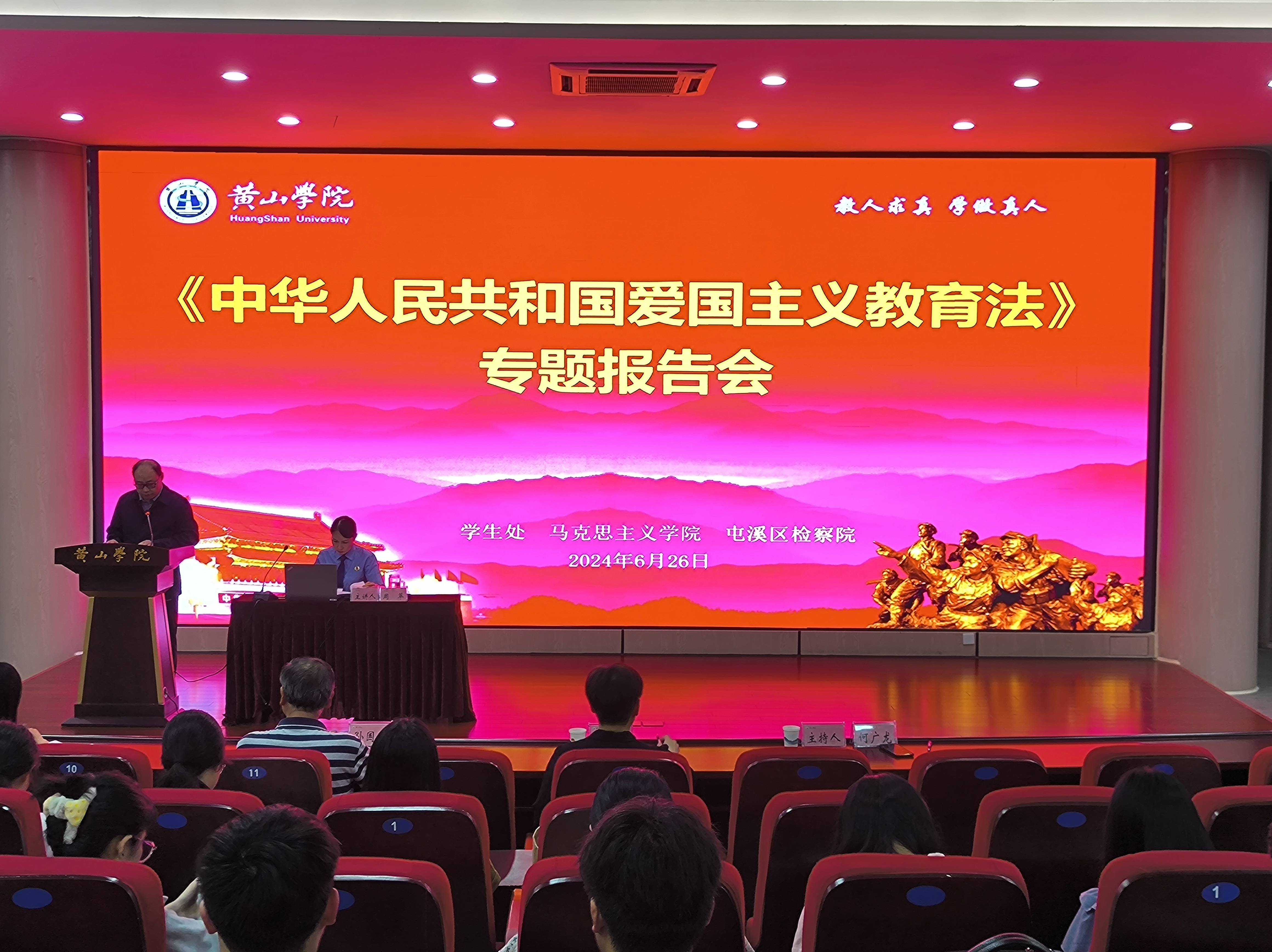 6月26日下午,我校在率水校区文端楼二楼报告厅举办爱国主义教育法专题报告会暨6月份辅导员工作例会。会议邀请了屯溪区检察院副检察长周萃作《中华人民共和国爱国主义教育法》主题报告,学习了我校新修订的学生工作制度并进行了解读。会议由学生处相关负责人主持,全校专兼职辅导员、思政班主任、思政委员参加会议。