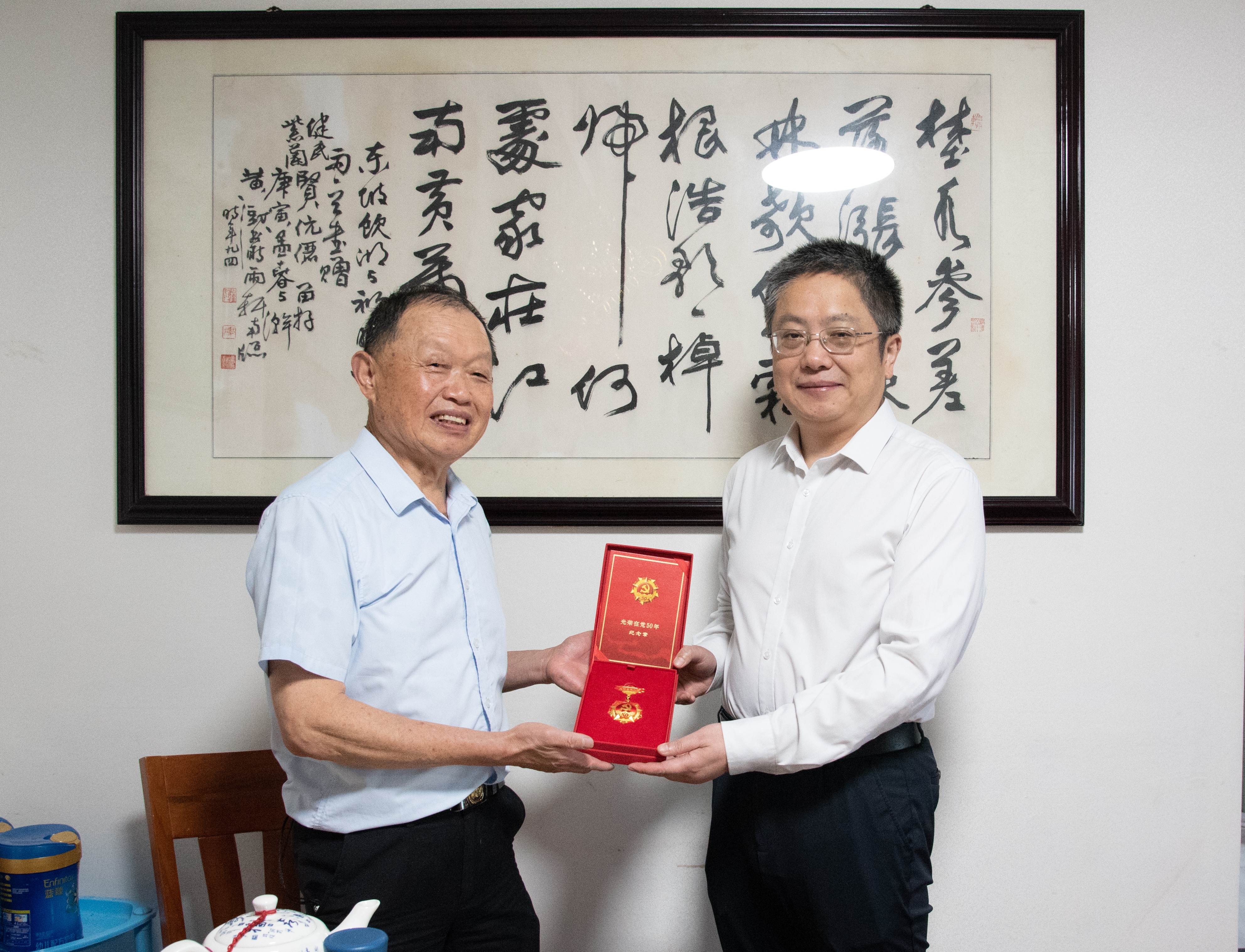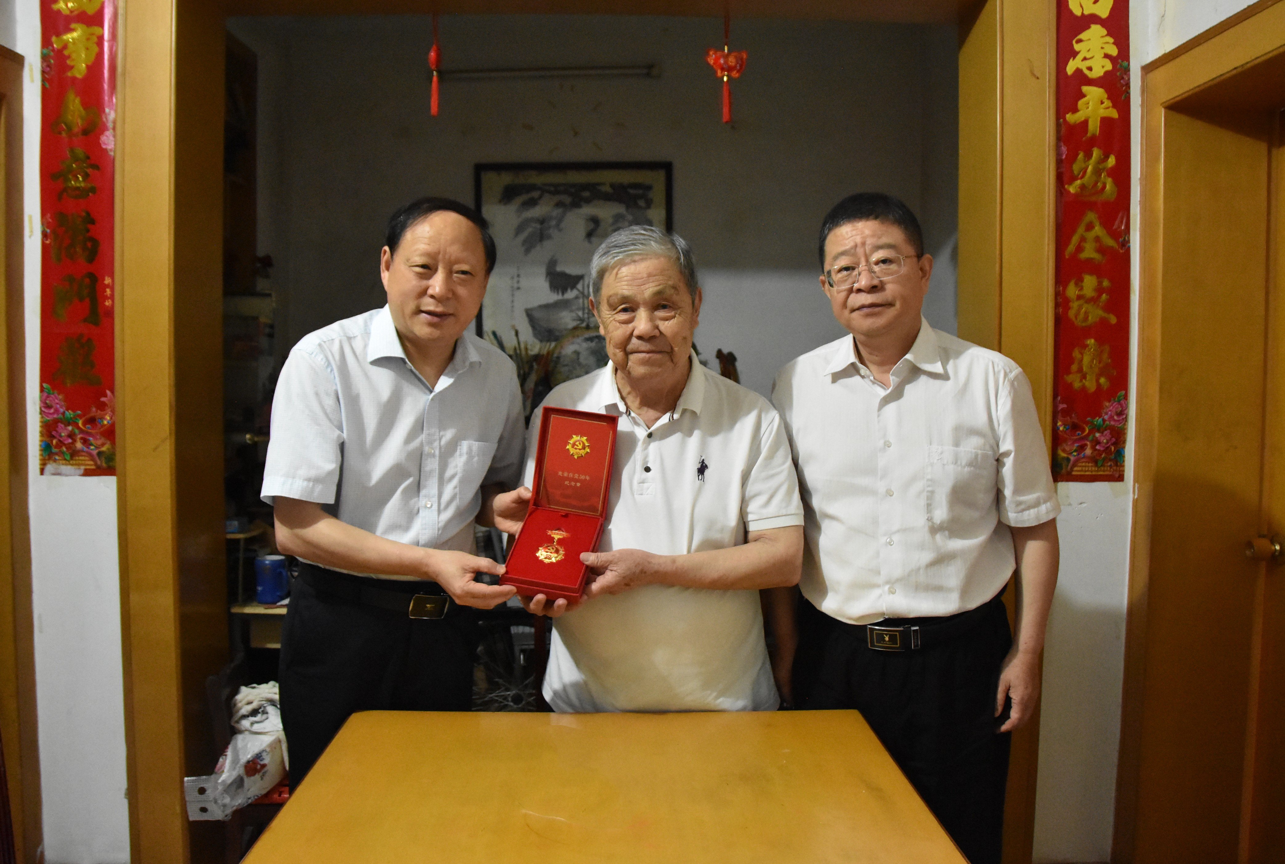 在老党员汪维玉的家中,校党委书记李铁范为他颁发了“光荣在党50年”纪念章,向他致以诚挚的问候和崇高的敬意。