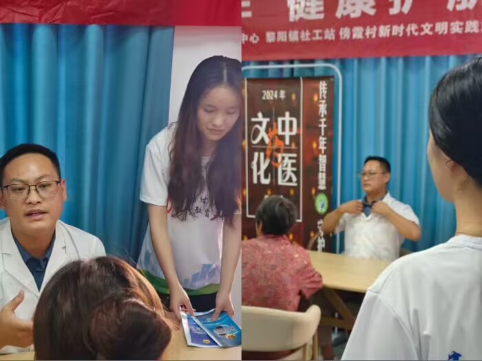7月5日,团队根据预先安排好的计划,前往黄山市屯溪区黎阳镇傍霞村村委会对当地老人进行反诈骗宣传、交通安全知识的普及以及协同社区开展“乐享晚年 健康护航”中医义诊活动。