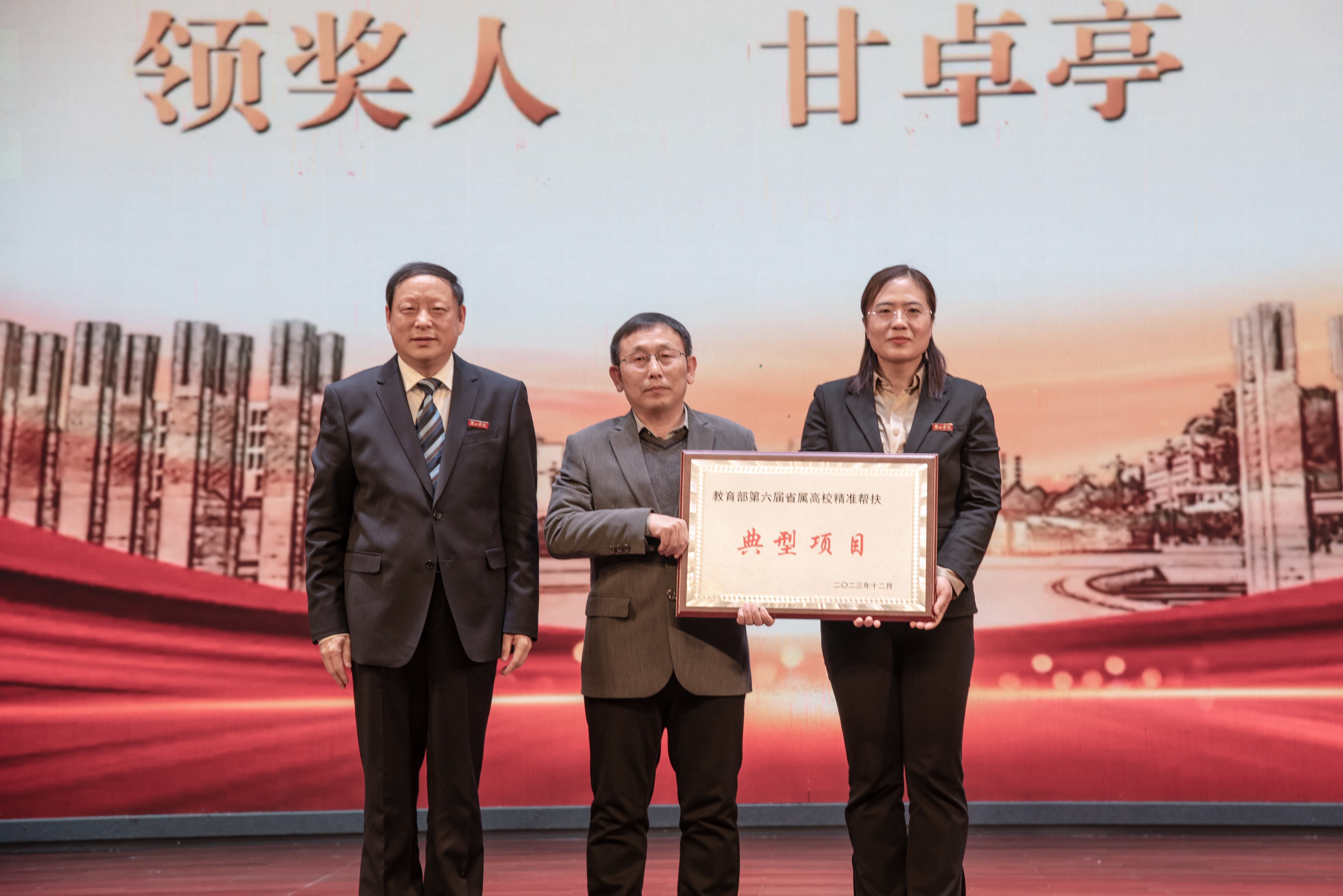 李铁范为荣获教育部第六届省属高校精准帮扶典型项目团队代表甘卓亭、姚婷颁奖