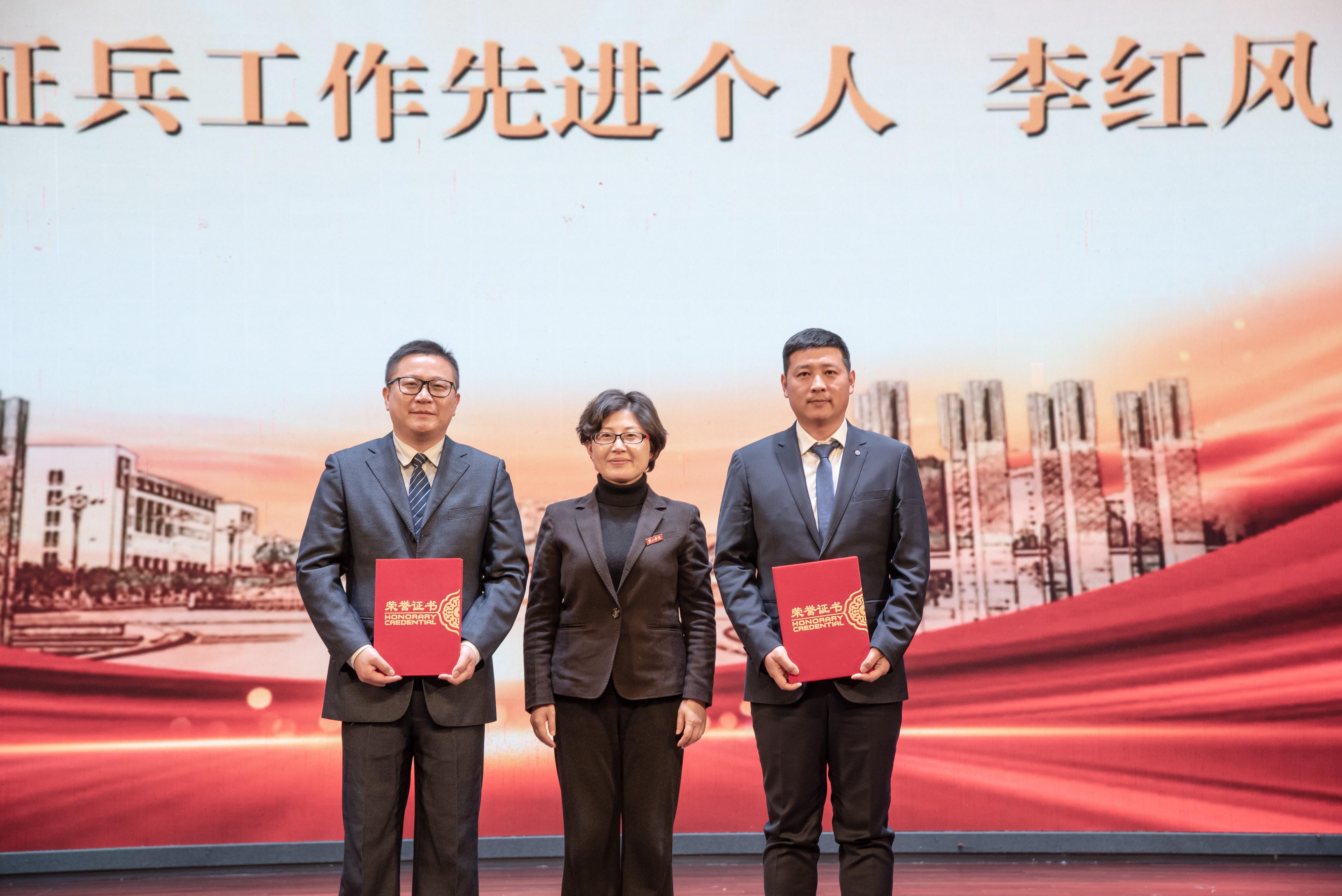 章文静为获得全国“三下乡”社会实践优秀个人徐勇、安徽省征兵工作先进个人李红风颁奖