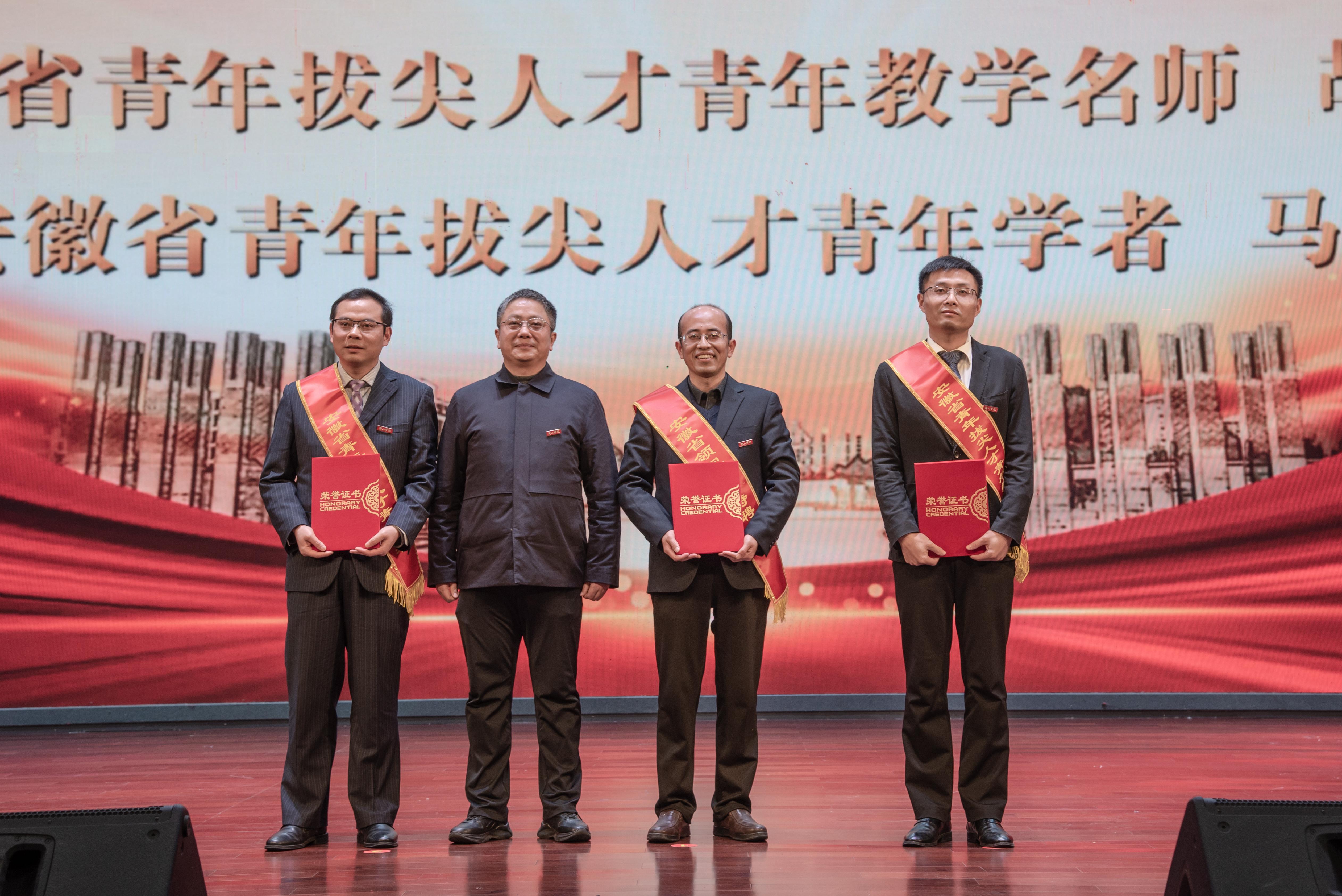 李庆宏为安徽省领军人才特聘教授陈珍海、安徽省青年拔尖人才青年教学名师胡建伟、安徽省青年拔尖人才青年学者马堃颁奖