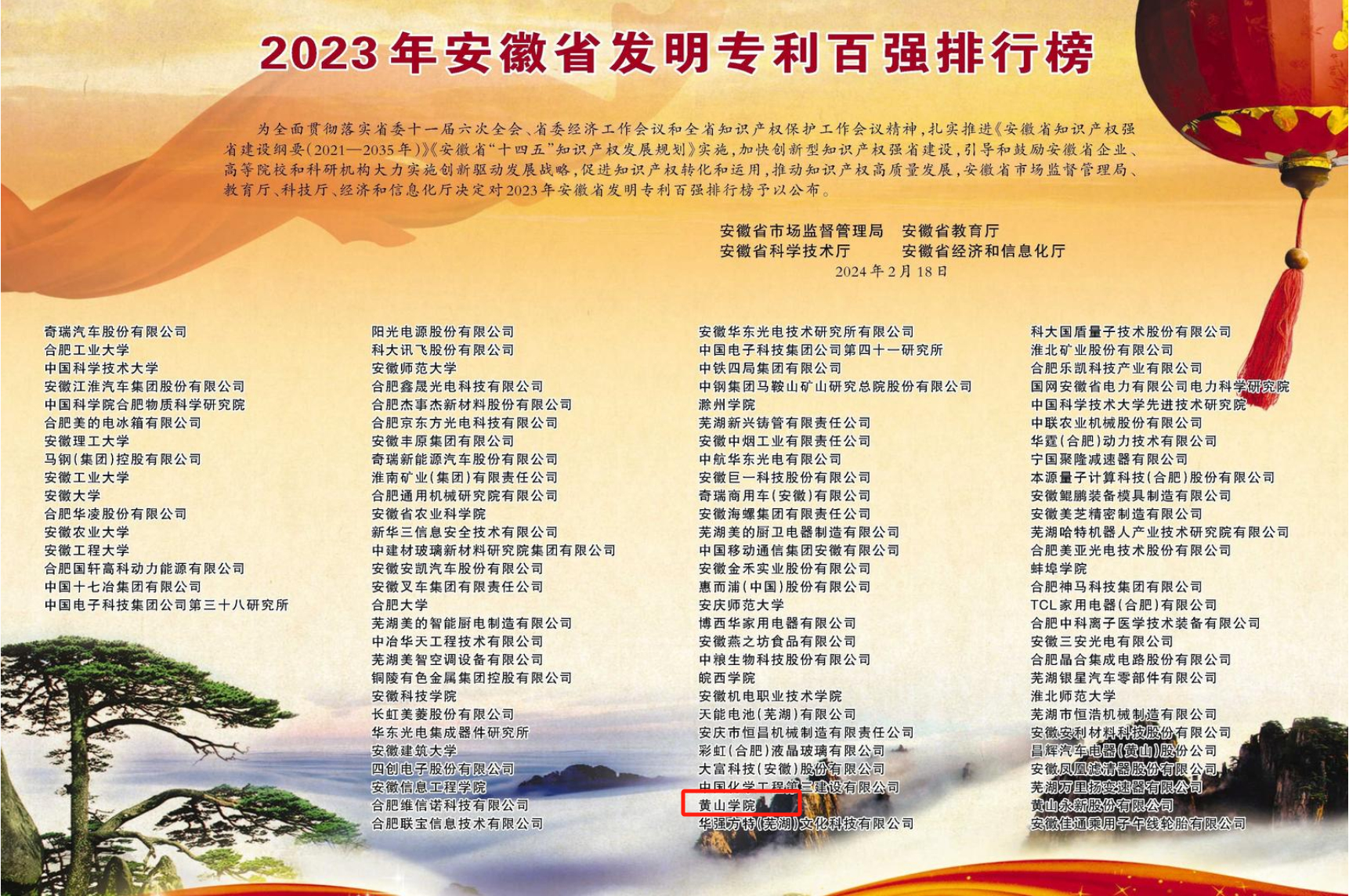 2月18日,安徽省市场监督管理局、省教育厅、省科学技术厅、省经济和信息化厅联合发布了2023年安徽省发明专利百强排行榜,我校荣登榜单。