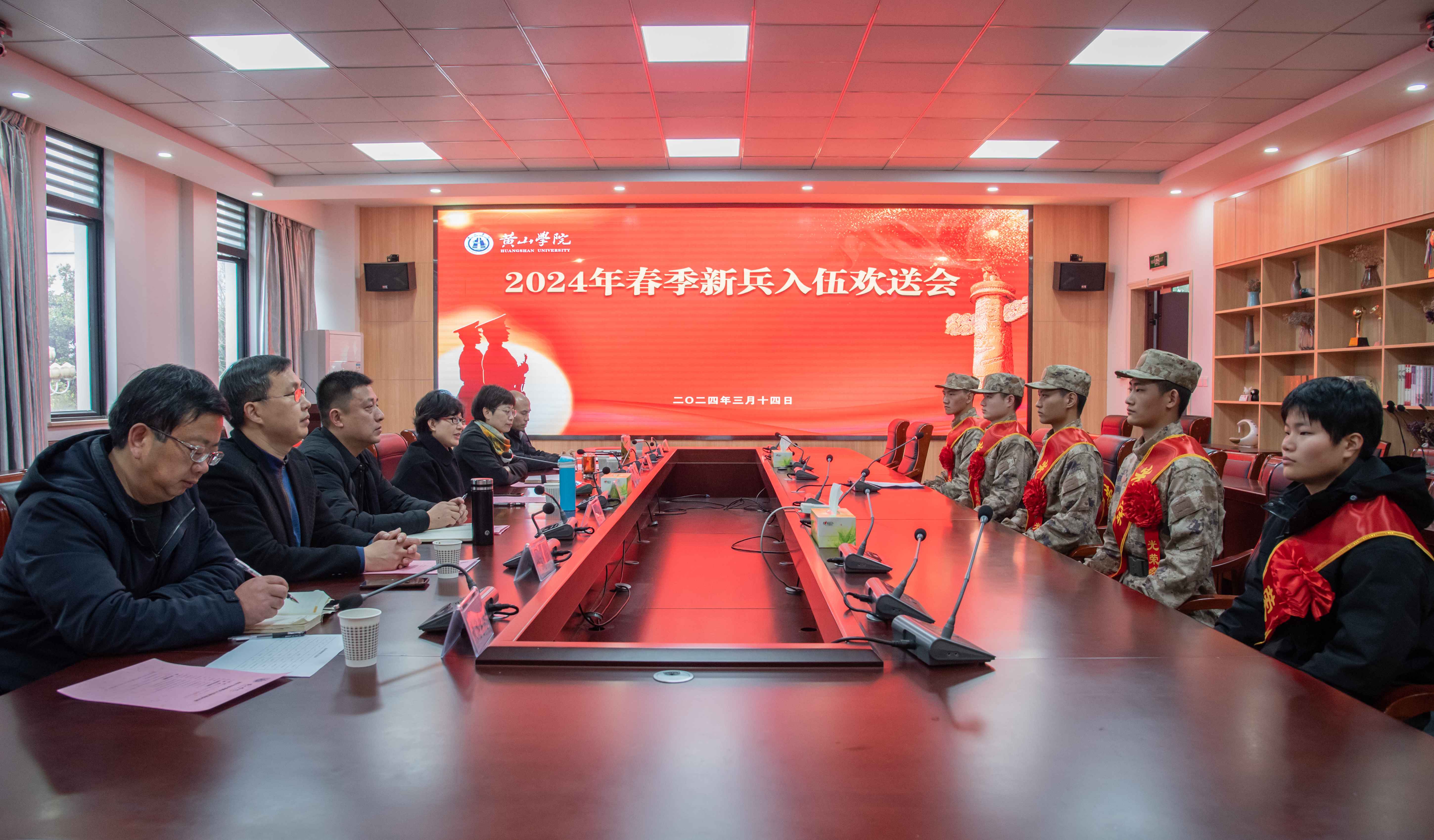 3月14日上午,我校在率水校区文汇楼306室举行2024年春季新兵入伍欢送会。校党委副书记章文静参加会议并讲话,校征兵工作领导小组成员单位及相关学院负责人参加会议。会议由学生处负责人主持。