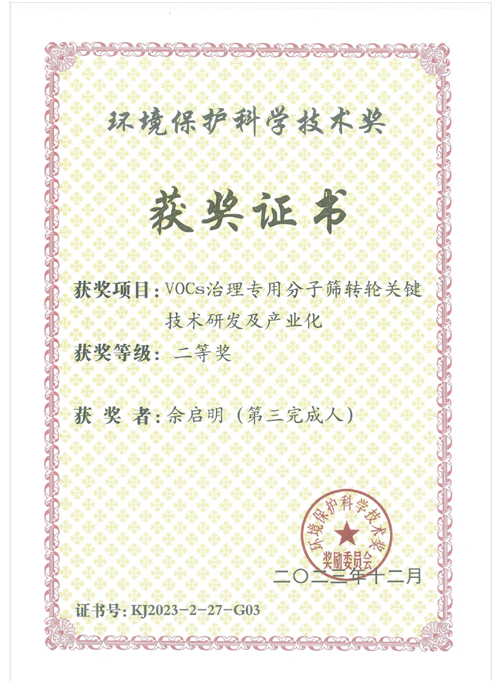 近日,由我校化学化工学院教师佘启明博士参与研发的《VOCs 治理专用分子筛转轮关键技术研发及产业化》项目荣获“2023年度环境保护科学技术奖”二等奖(第三完成人)。