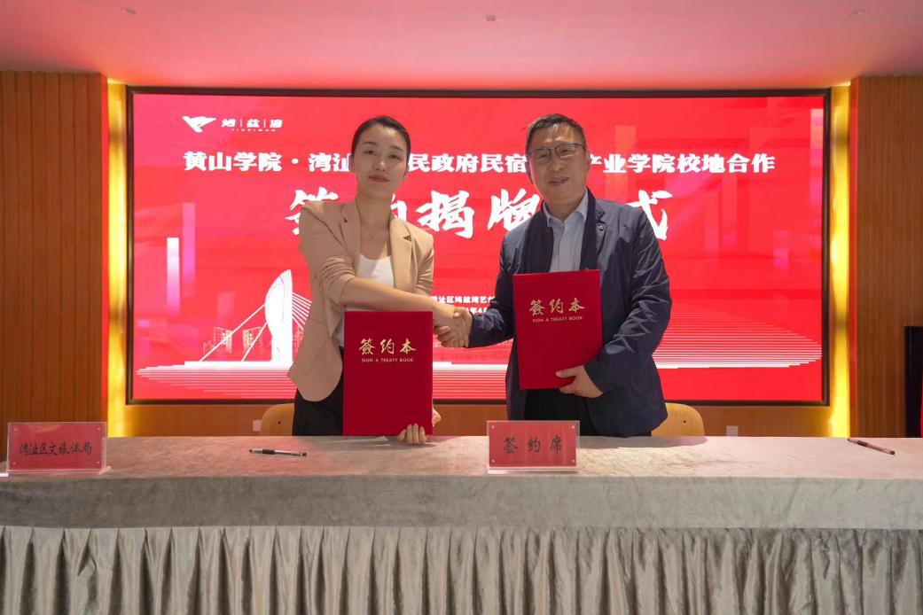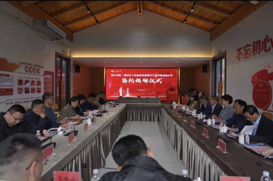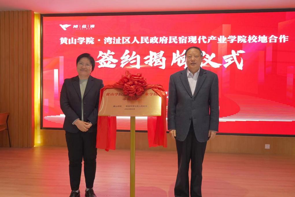 李铁范与赵彗星共同为黄山学院民宿现代产业学院示范基地揭牌。我校旅游学院负责人与教师代表就合作内容等方面进行了介绍和说明,并与湾沚区文旅体局签署了民宿现代产业学院校企合作协议。