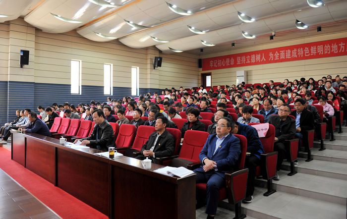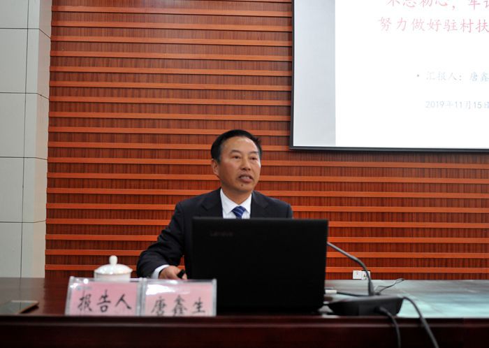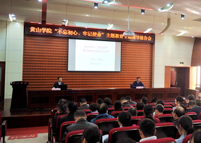 11月15日下午,我校在逸夫图书馆二楼报告厅举办“不忘初心、牢记使命”主题教育专题辅导报告会。科研处处长、校驻潜山市天柱山镇风景村扶贫工作队队长唐鑫生作题为《不忘初心,牢记使命 努力做好驻村扶贫工作》的专题辅导报告。副校长胡善风,党委委员、副校长张德学,党委委员、宣传部长、艺术学院党委书记、院长张赛,党委委员、教务处处长张小明,全校副处级以上领导干部,各党支部书记,各学院教师、学生党员代表参加报告会。报告会由张赛主持。