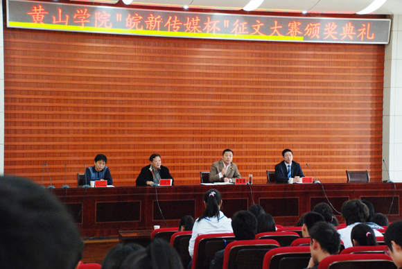4月28日下午,由图书馆联合皖新传媒黄山新华书店有限公司举办的“皖新传媒”杯征文大赛颁奖典礼在逸夫图书馆二楼报告厅举行,为本次纪念征文大赛画上了圆满的句号。副院长樊嘉禄、图书馆馆长方春生、皖新传媒黄山新华书店有限公司董事长兼总经理肖金和、图书馆副馆长冯大庆等出席颁奖典礼。