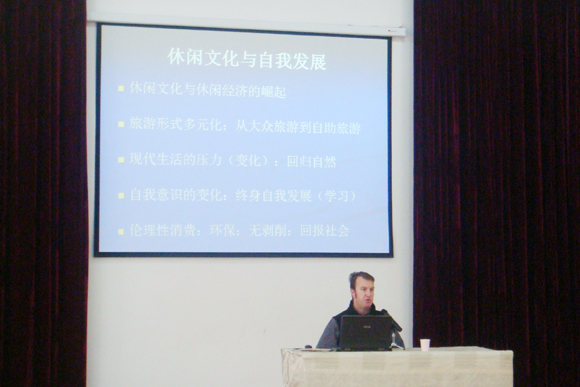 Gary Sigley给旅游学院师生我的作了题为“外国人眼中的中国乡村旅游开发”学术报告。他用流利的汉语向同学们介绍了自己新课题的研究方向,讲解了生态社区旅游、扶贫旅游、驴友文化、伦理性旅游以及责任性旅游等新概念,着重就中澳两国生态旅游的发展情况进行了比较,阐述了休闲文化与自我发展的相关内容。