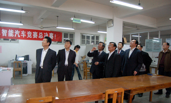 在信息工程学院的创新实验室,校领导要求相关单位负责人要做好参加7月份省“飞思卡尔”杯智能汽车比赛的准备工作,争取获得更好的成绩。校领导视察了该院的机房等地。