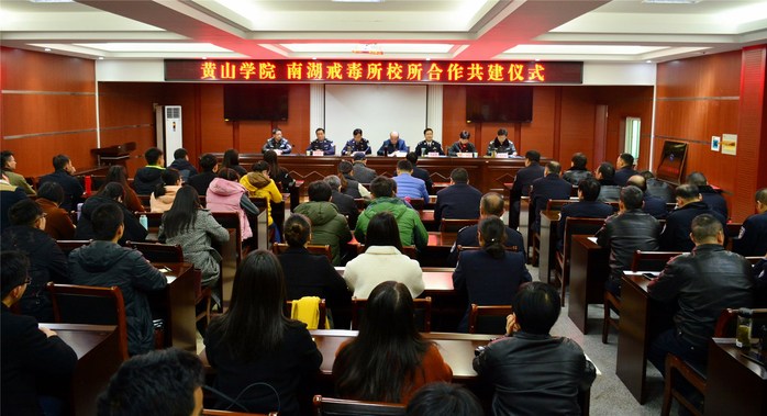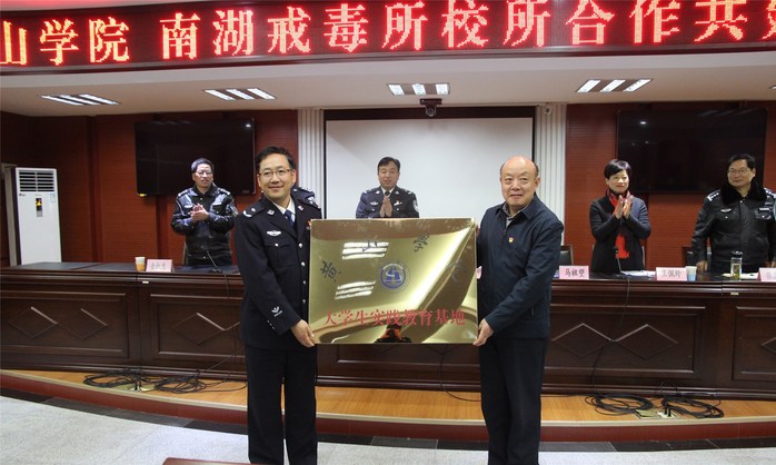 胡家俊授予南湖强制隔离戒毒所“黄山学院大学生实践教育基地”牌匾,学生处处长王佩玲与戒毒所副所长张庆高签订共建协议。