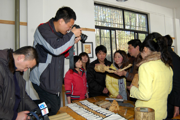 新华社通稿称:“2009年,安徽省黄山市黄山学院艺术系首次开设徽文化雕刻艺术实践课程,聘请民间工艺大师为大学生传授徽派竹木雕刻技艺,让大学生在了解徽文化的同时,传承“非遗”技艺。以石雕、木雕和砖雕为代表的“徽州三雕”艺术是古徽州数百年来的艺术结晶,其技艺被列入国家首批非物质文化遗产推荐名录。”