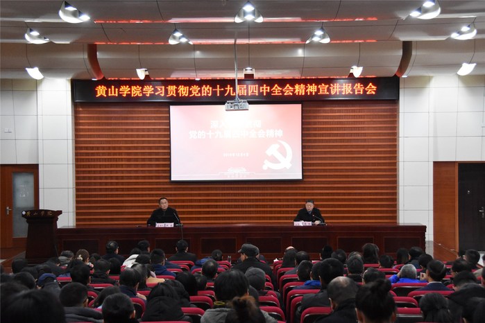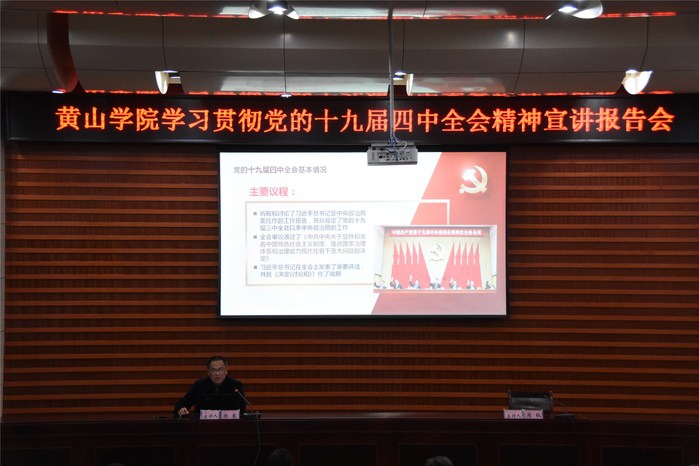 12月4日下午,我校在逸夫图书馆二楼报告厅举行党的十九届四中全会精神首场宣讲会,党委委员、宣传部长、艺术学院党委书记、院长张赛作了以“深入学习贯彻党的十九届四中全会精神”为主题的宣讲报告。校领导汪枫、李铁范、胡家俊、胡善风、刘英旺、张德学、陈家祥,党委委员、组织部长、办公室主任周权,党委委员、教务处处长张小明出席宣讲会,全体科级以上干部、党支部书记、马克思主义学院全体教师参加宣讲会,宣讲会由周权主持。