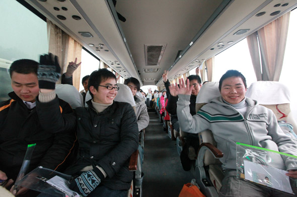 1月9日早上7时,雾霭弥漫,晨光初露,11辆金龙豪华大巴车在校门口整装待发。团委老师和20位志愿者迅速摆开阵脚,进入工作状态,引导陆续到来的考研生们次序上车,并为他们提供茶水,提醒他们注意保管好自己的物品,放松心情,迎接考试。在冬日的校园里,志愿者们胸前佩戴的团徽和红色工作牌,以及专车挡风玻璃上贴的“祝黄山学院全体考生考研顺利”横幅,显得格外醒目、好看。
