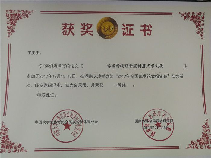 12月13至15日,2019年全国武术论文报告会在湖南师范大学举办。国家体育总局武术研究院副院长、武术运动管理中心副主任、中国武术协会副主席张征,教育部学生体育协会联合秘书处秘书长薛彦青等领导嘉宾出席大会。我校体育学院教师王庆庆参加会议,其撰写的论文《场域新视野管窥村落武术文化》获专题报告一等奖。