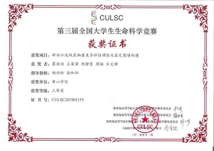 根据竞赛要求,学校于5月份遴选出20个项目团队报名参加。经评审专家网评、省赛选拔、现场答辩等环节评选,我校生命与环境科学学院教师吕彩云、徐和阳指导,代琳等同学的项目《新安江流域抗生素耐药多样性调查及防治建议》,教师佘新松指导,唐敏等同学的项目《基于代谢组学的高通量筛选新古尼异虫草镇静镇痛组分》和教师杨雨玲、徐和阳指导,葛扬浩等同学的项目《新安江流域底栖藻类多样性调查及鉴定图谱构建》均获得全国三等奖;吴永祥、陈向阳老师指导,王婷婷等同学的项目《黄山臭鳜鱼传统发酵过程中微生物群落动态变化分析及安全性评价》获得全国优胜奖。