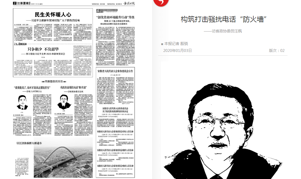 1月3日,安徽日报、安徽电视台分别以《构筑打击骚扰电话“防火墙”——访政协委员汪枫》《汪枫:打击整治骚扰电话》为题报道了第十二届省政协委员、校党委书记汪枫“关于整治‘电话扰民’问题的建议”的提案。