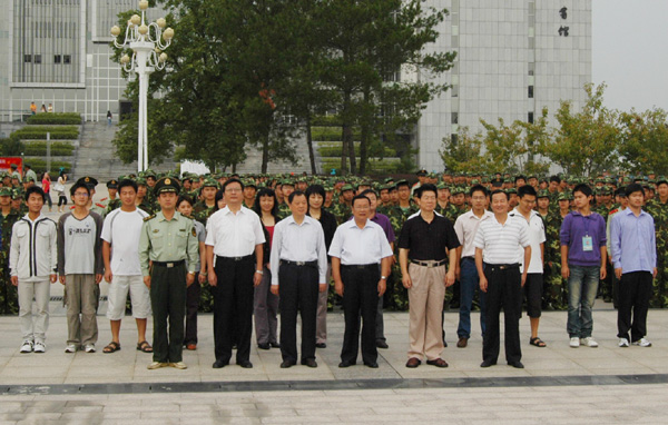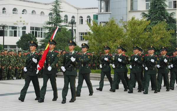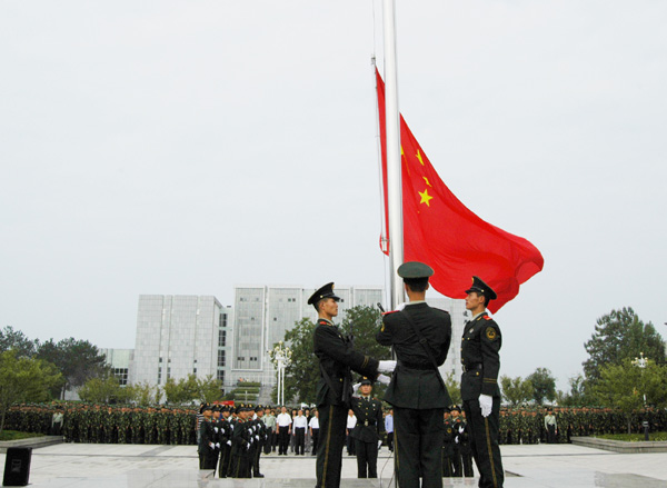 09级1000余名新生身着迷彩服,满怀激动,分成12个方阵早早地来到广场,期待着那一庄严时刻的到来。8:00,由20名武警战士组成的护旗方阵迈着正步进场,全场以立正姿势迎接国旗。三名升旗手走上旗台,嘹亮的国歌响起,红旗冉冉升起,领导、老师和同学们注目着红旗,唱起了国歌。场面庄严、肃穆而神圣。