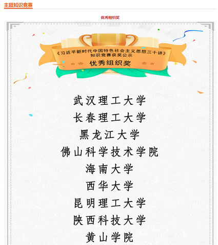 2019年9月至11月,由易班网举办的“习近平新时代中国特色社会主义思想网络思政宣传活动”中的《习近平新时代中国特色社会主义思想三十讲》主题知识竞赛获奖结果揭晓,我校在此次活动中荣获优秀组织奖。