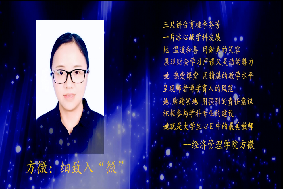 兼任经济管理学院分党委纪检委员,积极组织和协助开展各种党建理论学习和主题实践活动,在纪检监察干部“争做守纪模范、争当执纪尖兵”主题征文活动中获得优秀奖。