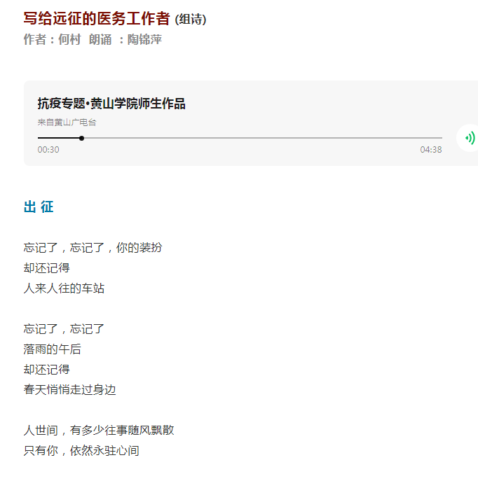 面对这场突如其来、态势凶猛的疫情,文化与传播学院副院长何村教授创作了组诗《写给远征的医务工作者》,由《出征》《又向硝烟战火走去》《战友》三首诗组成,用诗歌讴歌逆行者,传递人间真情,擂响战鼓,共克时艰!