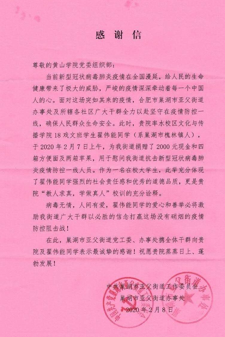 感谢信称,在全面阻击新冠肺炎疫情蔓延的特殊时期,翟伟能同学于2月7日向亚父街道捐赠了2000元现金和四箱方便面及两箱苹果,用于慰问街道抗击新冠肺炎疫情防控一线人员。作为一名在校大学生,此举充分体现了翟伟能同学强烈的社会责任感和优秀的道德品质,更是黄山学院“教人求真,学做真人”校训的充分诠释。病毒无情,人间有爱,翟伟能同学的爱心和善举必将激励街道广大干群以必胜的信念打赢这场没有硝烟的疫情防控阻击战。巢湖市亚父街道党工委、办事处特向黄山学院及翟伟能同学表示衷心感谢。