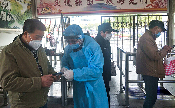 “您好,请用手机扫描这里的二维码,填写个人真实信息,进行身体健康状况登记……。”3月17日15时,我校机关干部钱峰耐心地对刚刚抵达黄山火车站的乘客介绍注意事项,帮助他们进行信息登记。