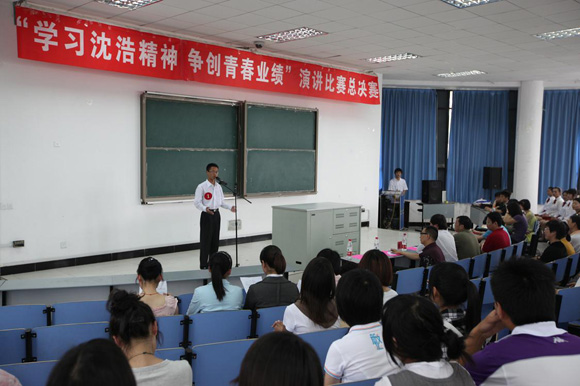 5月26日中午,我校大学生“学习沈浩精神,争创青春业绩”演讲比赛总决赛在南区第二教学楼一楼报告厅举行,90分钟紧凑而紧张的展示,12位选手喜捧璀璨的奖杯:旅游学院王洵、社科系马君、经济管理学院徐亚梅荣获一等奖;教育系后杏萍、文学院姜玮、艺术系杜�S治、外语系徐青松获二等奖;体育系董明艳、教育系张雅茹、化学系李雅莉、旅游学院胡景鹭、文学院刘静获得比赛三等奖。