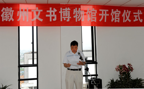 7月6日上午,在文化生态保护学术研讨会召开之际,设在逸夫图书馆六楼的黄山学院徽州文书博物正式开馆迎宾。在开馆仪式上,校党委书记汪良发、市政协副主席胡宁共同为徽州文书博物馆揭牌,院长汪建利发表讲话。