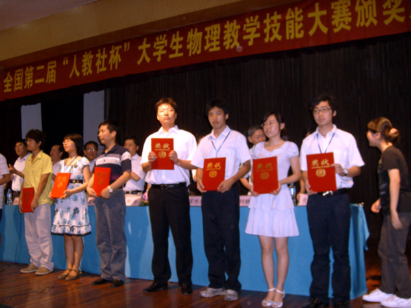 在7月31日结束的全国第二届“人教社杯”大学生物理教学技能大赛中,信息工程学院王光辉同学(指导教师:张燕飞、谢国秋)荣获一等奖,郭海季(指导教师:程和平、许媛)和许宏同学(指导教师:马堃、郑立)获得二等奖,陈奇、桂静和张羽喆三位同学获得三等奖。
