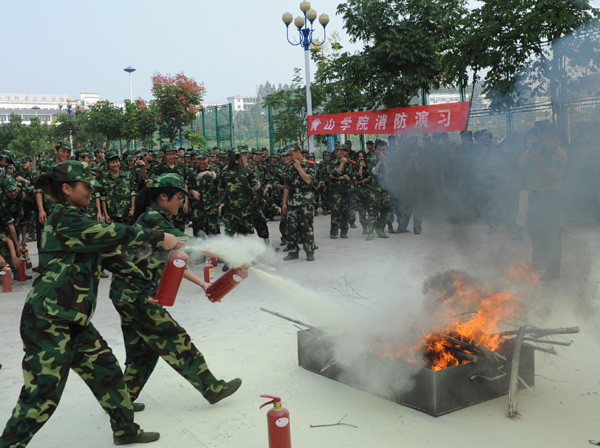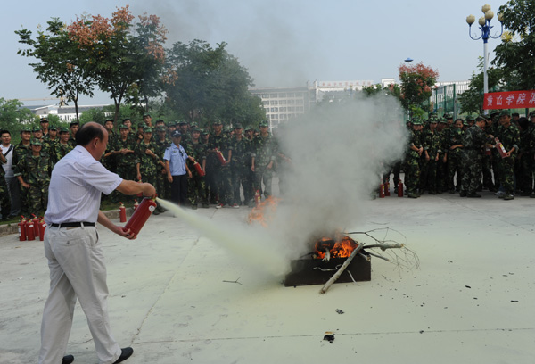 在防空警报解除后,消防演习开始。消防支队警官现场为大家讲解了灭火器的使用方法及在火灾发生时如何逃生知识。工作人员在事先准备好的铁箱中点起了一把火,现场顿时烈火熊熊,浓烟升腾,老师和同学们在消防官兵指导下拿起灭火器,扑灭了火焰。