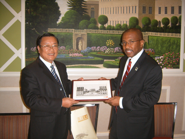 汪良发书记向美国特拉华州立大学校长赠送纪念品