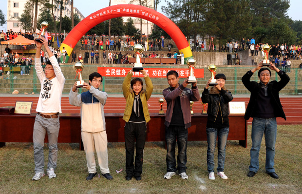 校工会主席邰储仓、体育系主任李昌军及各院系分管领导为获奖单位颁奖。颁奖仪式由运动会总裁判长董卫亚主持。 (文/李小梅 於丹青)