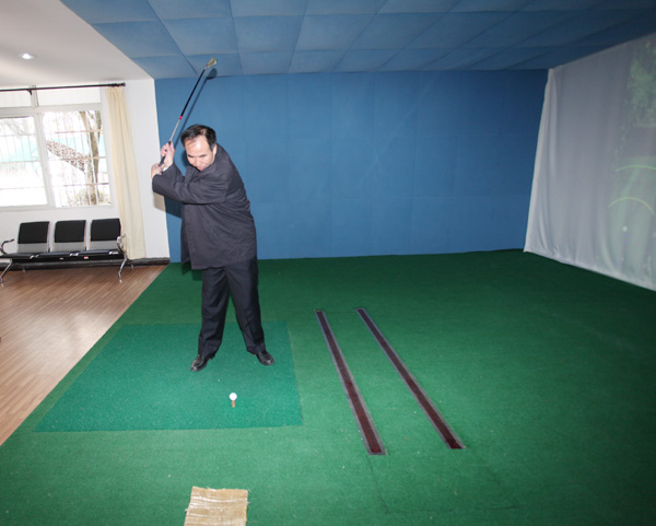 程艺在高尔夫模拟实训室挥杆小试
