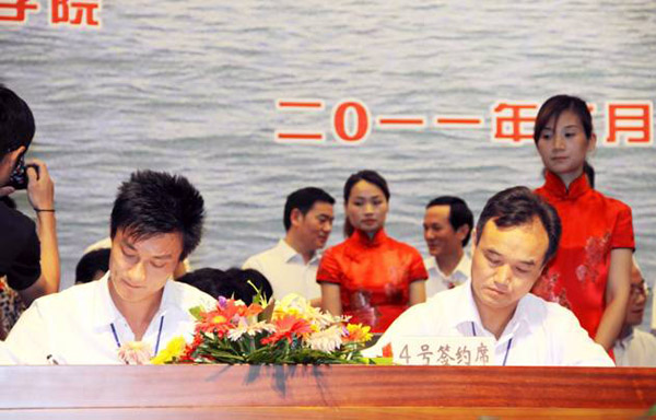化学系教师李长江代表校课题组与铜陵清华科技有限公司在主席台签订技术合作协议