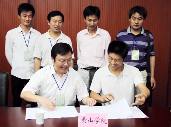 会上,副院长徐成钢代表学校与安徽合肥卓宜测控技术有限公司当场签订了《基于工业网络控制的全自动化工釜测控技术研究》、《化工制药行业发酵罐专用防堵型压力变送器的研发》技术合作协议;化学系教师李长江代表学校课题组与铜陵清华科技有限公司在主席台签订了《光敏染料的研发》技术合作协议。省人大、巢湖市、省教育厅、省科技厅领导巡展来到我校展区时,驻足观看了我校展出的科技成果,并亲切的与我校领导及工作人员留影纪念。