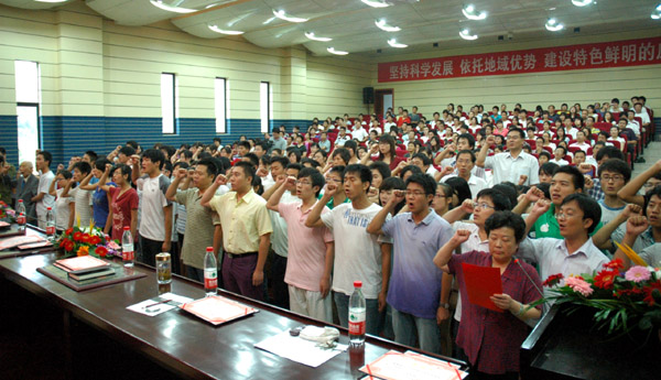 95岁高龄的离休老教授黄澍等90名师生预备党员代表面向党旗,举右手过肩握拳,在胡一宁的领誓下,进行庄严宣誓。