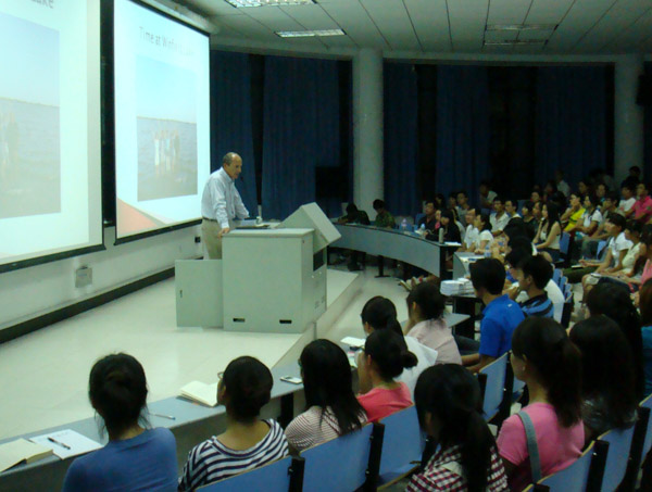 访问期间,大卫・霍夫梅斯特教授与我校外事办及相关院系负责人就进一步完善两校合作举办的中美教育学本升硕项目的工作进行了洽谈,并与中美教育学本升硕项目班任课教师就教学任务进行了交流和指导。9月7日晚,大卫・霍夫梅斯特教授还为我校学生做了题为《美国教授眼中的中国学生》的讲座,详细介绍了我校学子在美国西南学院学习和生活的情况,讲座吸引了广大同学前来参加,讲座结束后大卫教授还与报名参加本升硕项目班的同学们进行了面对面的交流。