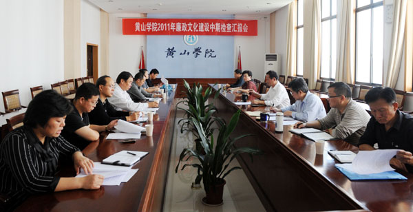9月28日下午,黄山学院2011年廉政文化建设中期检查汇报在逸夫图书馆三楼会议室召开。校党委委员、纪委书记吴邦贵出席并主持会议。校廉政文化建设领导组及12个处级成员单位负责人参加了会议。