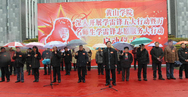 3月3日上午,虽是春雨绵绵,黄山学院“深入开展学雷锋五大活动暨万名师生学雷锋志愿服务大行动”启动仪式如期在南区逸夫图书馆广场进行,校领导汪建利、徐成钢、胡家俊,党委委员、组织部部长胡一宁出席仪式,学工委单位负责人,各院部党总支书记、团总支书记和各院部学生代表3000多人参加仪式,仪式由副院长胡家俊主持。