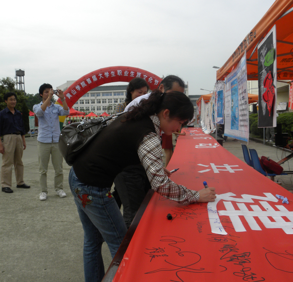 本次节水宣传周活动始于16日,形式多样且富有特色。通过校园网首页的浮动标语,悬挂节水宣传条幅和校广播台向全校师生员工进行节水宣传;在教学区宣传栏内张贴内容丰富的宣传图片,向全校师生员工进行有关节水的政策解读。校漫画社同学还在学生宿舍区宣传栏内通过寓教于乐的漫画形式进行节水宣传,一幅幅漫画形象地刻画了同学们平时生活中的节水小窍门,让同学们从中得到启发。19日下午,广大师生纷纷在写有“节水全校行动,共建生态校园”宣传标语的20米巨型横幅上签上自己的名字,表达自己强烈的节水意愿。