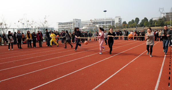 当日下午,阳光晴好。绕行完南区校园的女教师们纷纷赶到塑胶操场内参加了抬花轿接力、持杆赶球接力、钻呼啦圈接力、运“球”帷幄等项目。这些全为集体项目,在正式比赛前,不少老师反复练习琢磨取胜法门。在抬花轿比赛现场,每队8位女老师兵分四组,她们两两成对手握竹竿,把篮球抬在中间,一场比赛下来,四个回合,耗时最少者,取胜。比赛现场,不少男教师也在一旁加油指导,帮忙出主意。更有不少女教师把家里的孩子、老人也领来参观比赛,一起享受比赛的乐趣及这个春天不可多得的阳光。