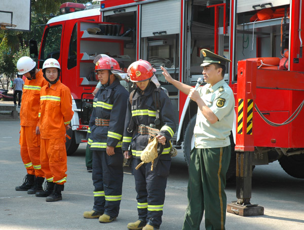武警屯溪区消防大队的工作人员向同学们展示了消防应急救援相关器材和设备