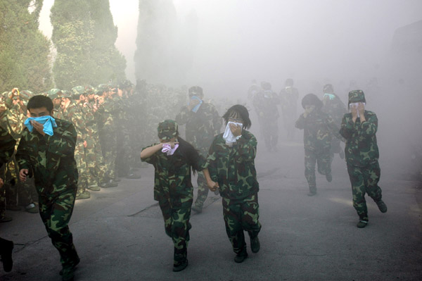 消防演习共分消防逃生演习、消防技能培训和消防救援器材展示三个部分。在南北校区,演习模拟学生公寓突发“火灾”,浓烟滚滚,随着警报声的响起,消防救援车辆驶入事发现场进行救援,数千名学生用毛巾捂住口鼻,迅速安全撤离到楼下的安全区域。