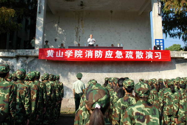 9月16日,我校在南、北校区举行黄山学院2012年消防应急逃生疏散演习。副院长胡家俊出席演习启动仪式并讲话。我校4200多名新生参加演习。