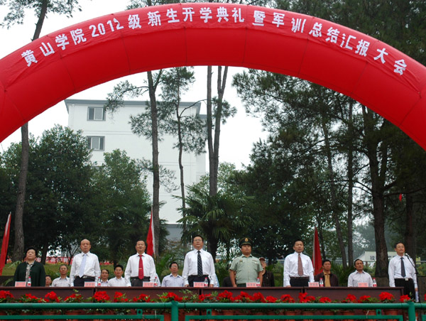 9月21日上午,黄山学院2012级新生开学典礼暨军训汇报总结大会在南区体育场隆重举行。校领导徐成钢、吴邦贵、樊嘉禄、胡家俊、叶军,党委委员、组织部长胡一宁,武警黄山支队副支队长陶善银出席大会。大会由校党委副书记叶军主持。