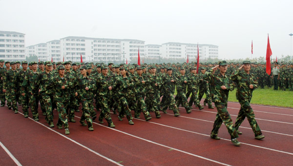 学生军训方队在雄壮的《解放军进行曲》中进行分列式汇报展示