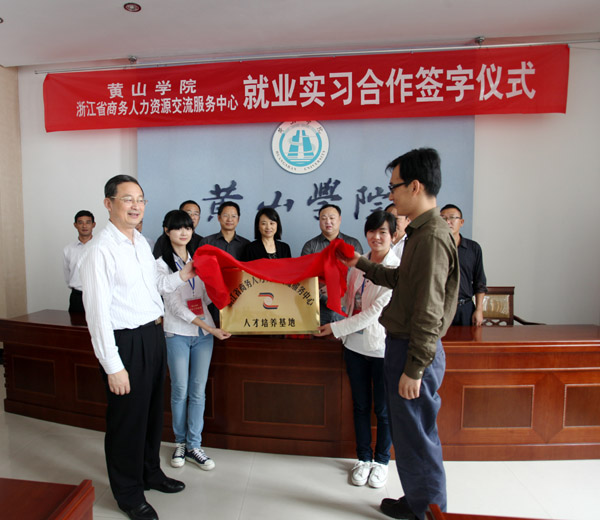 9月22日上午,黄山学院与浙江省商务人力资源交流服务中心共建实习就业基地签字仪式在逸夫图书馆三楼会议室举行。校党委副书记叶军为基地成立揭牌并讲话。