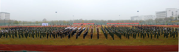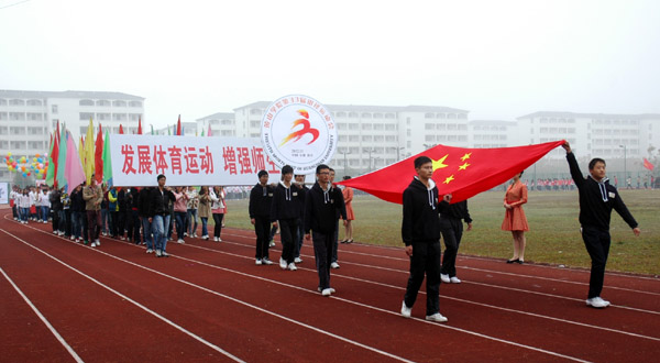 上午8点30分,在雄壮激越的《运动员进行曲》中,仪仗队手持国旗、会徽、标语牌率先通过主席台,在护旗手、彩旗队方阵的引领下,由各院部师生和部门教职工组成的代表团及由体育学院师生组成的裁判员方阵迈着整齐的步伐,精神饱满地从主席台前走过,接受领导和师生的检阅。
