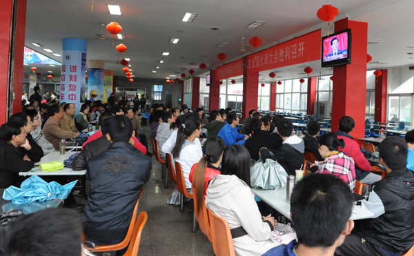 11月8日上午,中国共产党第十八次全国代表大会在北京人民大会堂隆重开幕。校领导徐成钢、汪建利、吴邦贵、樊嘉禄、胡家俊,党委委员、组织部长胡一宁与师生员工一起在南区一食堂一楼大厅观看了大会开幕式电视直播。